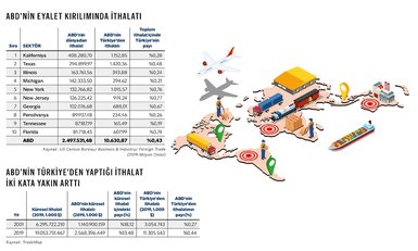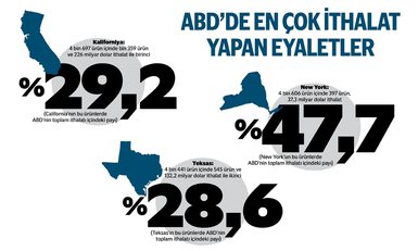 Eyaletlerin Türkiye'den yaptığı ithalata göre sıralaması incelendiğinde ise en çok ithalat 1,42 milyar dolar ile Teksas tarafından yapılırken, onu sırası ile 1,15 milyar dolar ile Kaliforniya ve 1,02 milyar dolarlık ile New York eyaletleri izliyor.