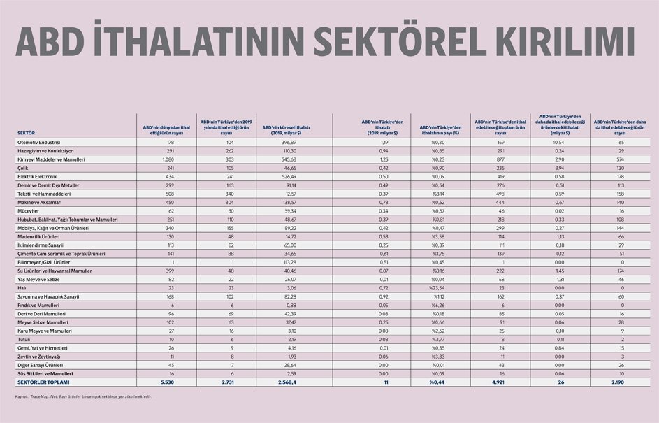 ABD, Türkiye'den 2019'da en çok tedariki 1,25 milyar dolar ile 'Kimyevi Maddeler ve Mamulleri' sektöründe yaparken, ikinci sırada 1,19 milyar dolarlık ithalatın yapıldığı 'Otomotiv Endüstrisi', üçüncü sırada ise 940 milyar dolarlık ithalatın yapıldığı 'Hazırgiyim ve Konfeksiyon' sektörü yer aldı.
