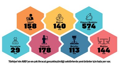 Ürün sayısında ABD, dünyadan en çok ithalatı bin 80 ürün ithal ettiği 'Kimyevi Maddeler ve Mamulleri' sektöründe yaparken Türkiye'den ise bu sektörde 303 ürün ithal edildi. Yapılan analize göre Türkiye'nin bu sektörde ABD pazarına 574 ürün daha ihraç edebileceği görülüyor. Bu 574 üründe ABD'nin küresel ithalatı ise 2,90 milyar dolar. Ürün sayısı bakımından ikinci sırada en çok ithalatı 508 ürün ithal ettiği 'Tekstil ve Hammaddeleri' sektöründe yaptı. Türkiye'nin bu sektörde bu pazara 2019'da 340 ürün ihraç ettiği ve 158 ürün daha ihraç edebileceği görülürken, bu ürünlerde ABD'nin küresel ithalatı ise 590 milyon dolar oldu.