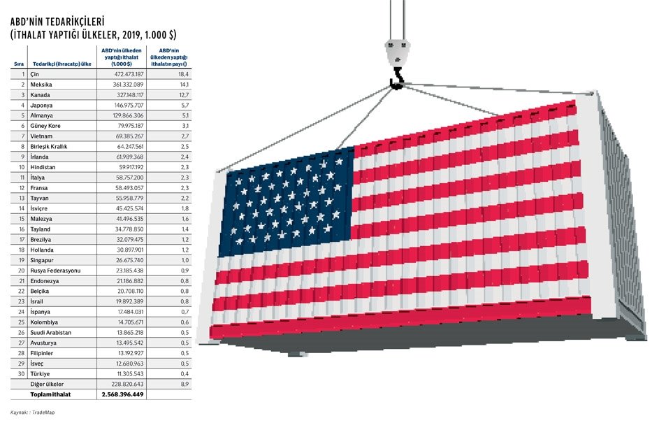 Gerek ABD, gerekse de Avrupa Birliği'nin, Asya-Pasifik'te yoğunlaşan 'üretim' ve 'rekabet becerisi'ne karşı, Çin ve Asya'ya bağımlılıklarını azaltacak şekilde, nüfus gücü, işgücü, üretim gücü, ticaret gücü olan yeni partner ülkelerle iş birliğini yoğunlaştırmaları gerekiyor. Hareket kabiliyeti yüksek, teknolojisini geliştirme becerisi yüksek bir stratejik ortak olarak, Türkiye'ye her zamankinden fazla ihtiyaç var. Bugünkü tablo gelişen ülkelerdeki ihracatçılara önemli bir fırsat doğuruyor. Türkiye'nin de içinde yer aldığı önde gelen gelişen ülkelerin ihracatçıları, üreticileri, 'ticaret savaşı'nı kendilerini daha da mükemmelleştirebilecekleri, daha da 'rekabetçi' olabilecekleri bir 'meydan okuma', bir 'fırsat' olarak görüyor. Bu noktada pek çok soru cevaplanmaya muhtaç olarak karşımıza çıkıyor: 'Dünyanın en büyük ithalatçısı olan ABD'ye daha fazla nasıl ihracat yaparız?', 'Şirketlerimiz doğru bir strateji izliyor mu?' 'ABD pazarında ihracat yapılabilecek yeni sektörler hangileri?' İhracatçılarımız için kritik önemdeki bu soruların cevapları için ABD'nin 2019 ithalat rakamlarını incelemek gerekiyor.