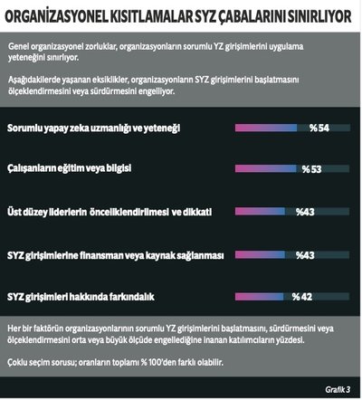 SYZ'nin sınırlı olarak uygulanmasına yol açan diğer faktörler, YZ'nin teknik karmaşıklıklarından ziyade genel organizasyonel zorluklarla ilintili. Katılımcılara şirketlerinin SYZ girişimlerini başlatmasını, sürdürmesini veya ölçeklendirmesini hangi faktörlerin engellediği sorulduğunda bildirilen en yaygın faktörler, uzmanlık ve yetenek eksikliği, çalışanların eğitim veya bilgi yetersizliği, üst düzey liderliğin önceliklendirme noksanları, finansman ve farkındalıktaki yetersizliklerdi (bkz. grafik 3).