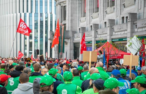 Greve giden yüzlerce çalışan, Brüksel'deki Belçika İşveren Federasyonu (FEB) önünde toplandı.