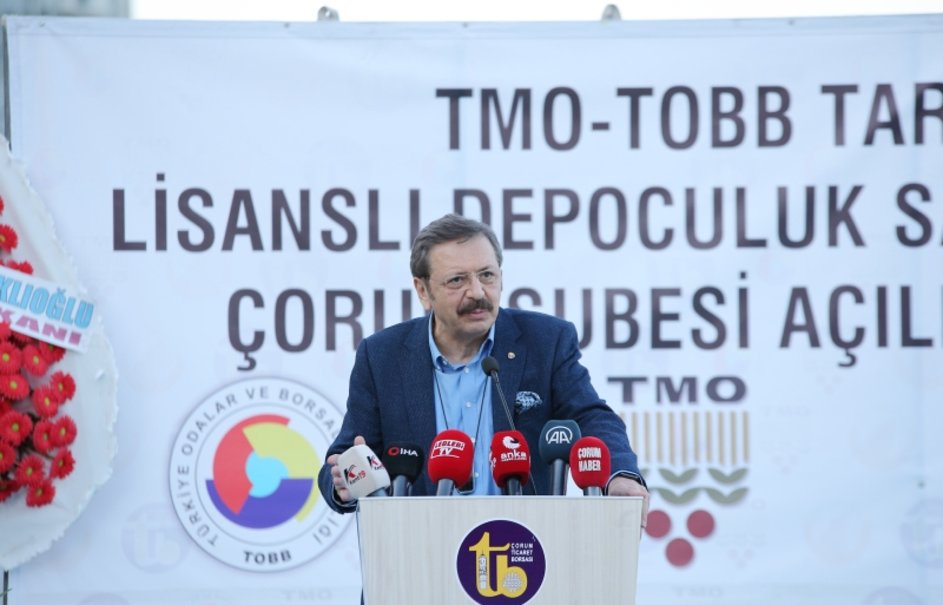 Burada konuşan Hisarcıklıoğlu, "Lisanslı depoculuğu ülkemize kazandırdık. Yaygınlaşmasına Toprak Mahsulleri Ofisi ile beraber öncülük ettik. Lisanslı depoculuk yetmez. Ürün İhtisas Borsası lazımdı. Onu da kurduk. Çorum Ticaret Borsası da ortağımız hep beraber yapıyoruz. Ayrı gayrı yok. Lisansı depolar ürünlerin hijyenik ve güvenli depolarda saklanmasına olanak sağlar. Böylece tarım piyasasında istikrar sağlanır, tarım ticareti kolaylaşır. Esas önemli olan tarım ticaretini kolaylaştırmaktı. Üreticinin bu sayede geliri artar" dedi.