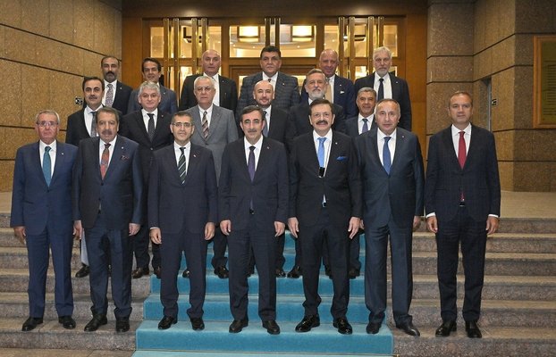TOBB Başkanı Rifat Hisarcıklıoğlu buluşmayla ilgili yaptığı yazılı açıklamada, Cumhurbaşkanı Yardımcısı Cevdet Yılmaz ve Cumhurbaşkanlığı Strateji ve Bütçe Başkanı İbrahim Şenel ile TOBB'da bir araya geldiklerini belirtti.