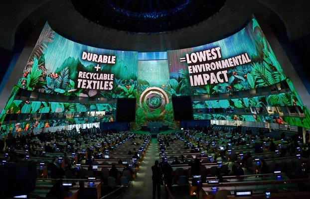 Üst düzey BM yetkilileri ile üye ülkelerin temsilcilerinin yer aldığı özel etkinlikte katılımcılar, Genel Kurul Salonu'nun ön duvarının tümünü kapsayan görsel haritalamayla sıfır atık çalışmaları konusunda bilgilendirildi. Salonun duvarlarına yansıtılan görsel haritalama yöntemiyle, moda ve tekstil atıklarına ilişkin verilerin yer aldığı projeksiyon (mapping) gösterisi yapıldı. "Atık kirliliğini önleyin" sloganıyla başlayan gösteride katılımcılara küresel atıkların 2050 yılında 3,8 milyar tona ulaşacağı, sadece plastik atıkların 400 bin ton olduğu, moda ve tekstil endüstrisinin her saniye bir kamyon kıyafet atığı oluşturduğu ve döngüsel modaya geçişin 2030'a kadar 700 milyar dolar tasarruf sağlayabileceği anlatıldı. Etkinliğin ana konuşmasını, BM Sıfır Atık Yüksek Düzeyli Şahsiyetler Danışma Kurulu Başkanı Emine Erdoğan yaptı.